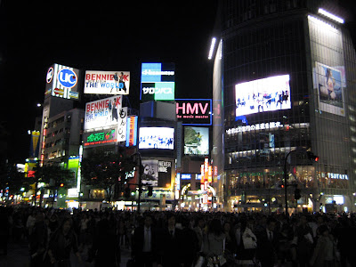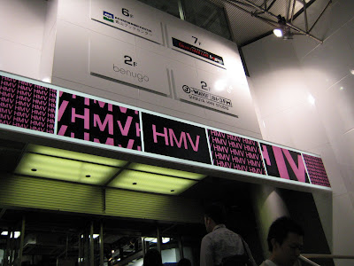 The pink and blue neon sign in the background is for HMV, probably Tokyo’s largest media chain, comparable to Virgin in New York, selling music and movies from around the world.