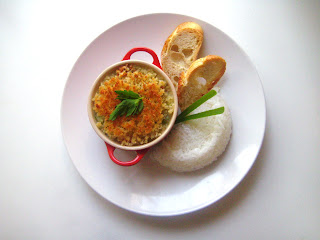 While that’s melting, spoon some of the curry into an oven-safe dish, such as my French onion soup bowl! Also, turn on your broiler to its highest setting. I just use my toaster oven set to broil.