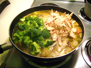 Because our chicken is already cooked, and the broccoli doesn’t take long to soften, we add these in last, after we’ve added our stew mix. As you can see, I just shredded the chicken breasts by pulling it apart by hand into bite-sized pieces.