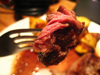 This is around a 12oz. rib-eye steak with a red-wine & beef-broth reduction sauce with sauteed mushrooms and potatoes roasted in a red-pepper and sun-dried tomato pesto.