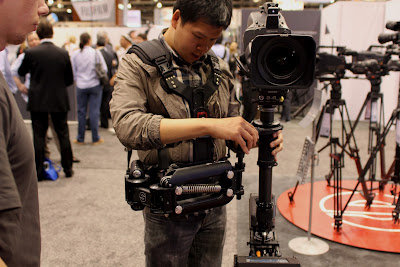 Here’s a 400mm (I think?… I’m the worst blogger ever) on a 1DX, the stills version of the latest in the 1D series. The photo rep guy told me was he was sad that everyone kept coming over thinking it was the 1DC, and would leave when they found it wasn’t. “This camera is cool too!,” he said. To which I responded with, “Ooh, Sachtler makes steadicams?!?” and walked over to try one on.